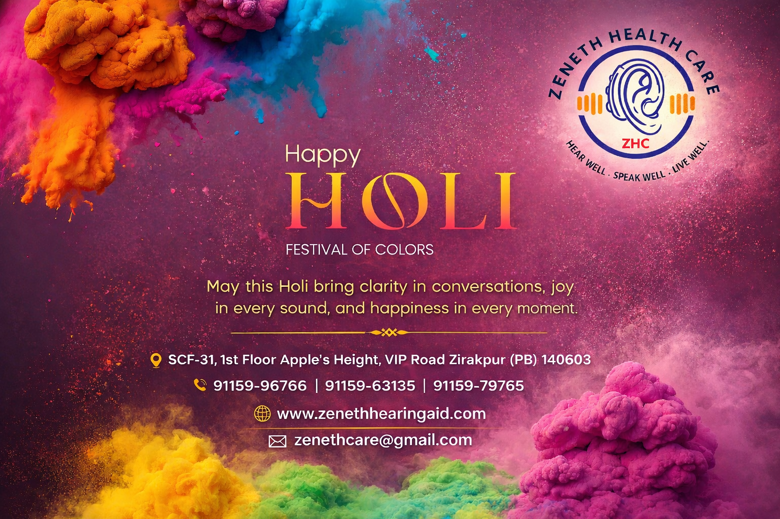 #HappyHoli #ZenethHealthCare #Holi2026 #FestivalOfColors #HearingCare #SpeechTherapy #HearingAidClinic #Zirakpur #Punjab/ #Himachal #Haryana #Chandigarh #panchkula #Hearing Aids